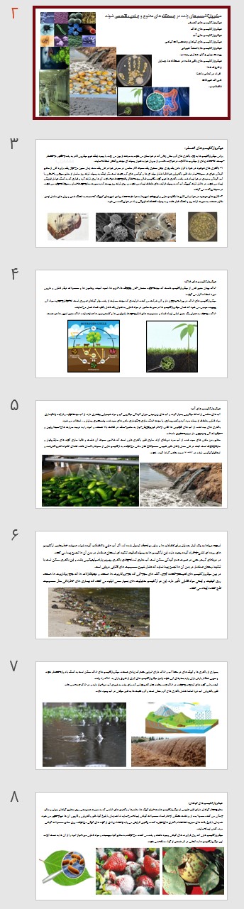 تقسیم بندی میکروارگانیسم ها از جهت راه های ورود به مواد غذایی- میکروارگانیسم های اتمسفر- میکروارگانیسم های خاک – میکروارگانیسم های آب- میکروارگانیسم های گیاهان – میکروارگانیسم ها با منشا حیوانی و انسانی – وسایل و تجهیزات مرتبط با مواد غذایی – افراد در تماس با مواد غذایی – خوراک حیوانات – فاضلاب